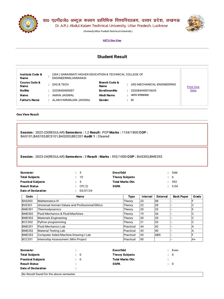 Session : 2022-23(REGULAR) Semesters : 1,2 Result : PCP Marks : 1134/1800 COP :