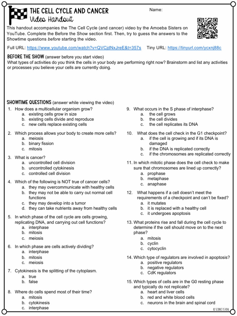 This handout accompanies the The Cell Cycle (and cancer) video by the Amoeba Sisters on