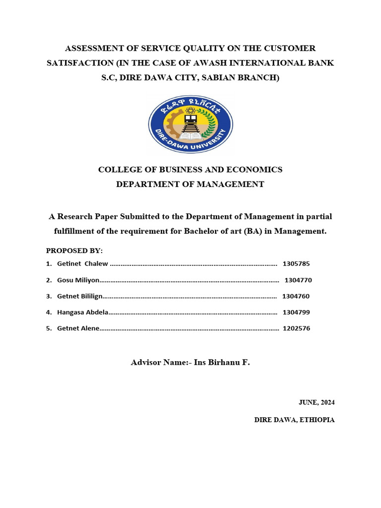 Quality On The Customer Satisfaction (In The Case Of Awash International Bank S.C, Dire