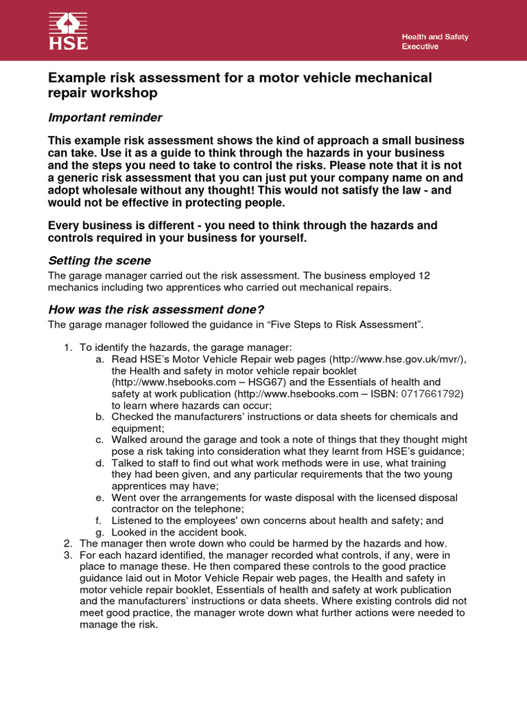 The garage manager followed the guidance in “Five Steps to Risk Assessment”.