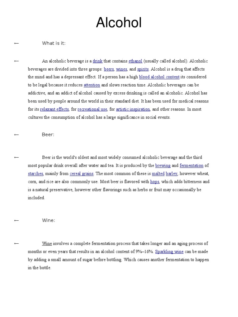 What is it: An alcoholic beverage is a drink that contains ethanol (usually called alcohol). Alcoholic beverages are divided into three groups: beers, wines, and spirits. Alcohol is a drug that affects the mind and has a depressant effect. If a person has a high blood alcohol content its considered to be legal because it reduces attention and slows reaction time. Alcoholic beverages can be addictive, and an addict of alcohol caused by excess drinking is called an alcoholic. Alcohol has been used by people around the world in their standard diet. It has been used for medical reasons for its relaxant effects, for recreational use, for artistic inspiration, and other reasons. In most cultures the consumption of alcohol has a large significance in social events.