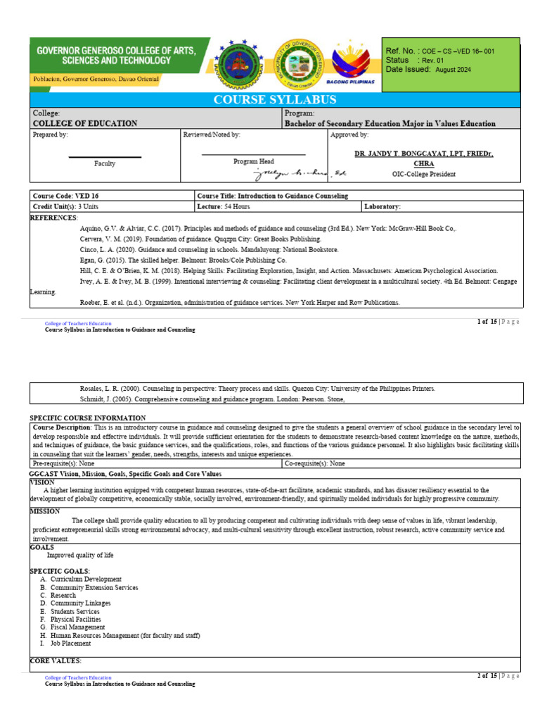 COLLEGE OF EDUCATION Bachelor of Secondary Education Major in Values Education