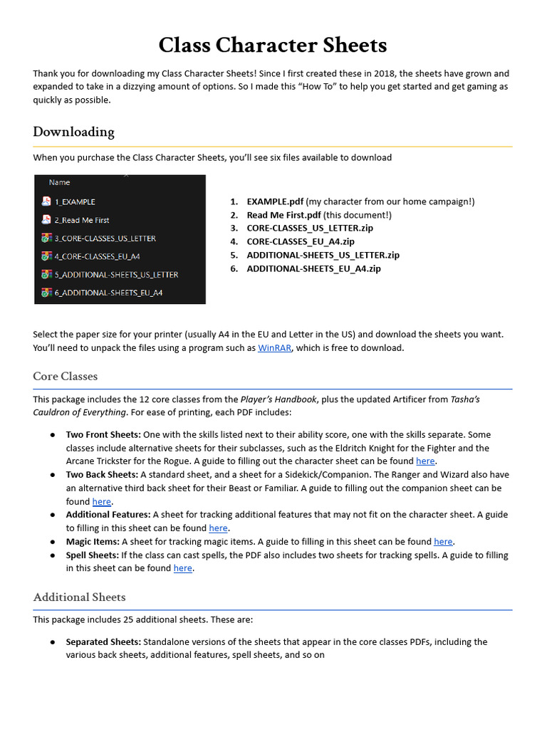 Thank you for downloading my Class Character Sheets! Since I first created these in 2018, the sheets have grown and