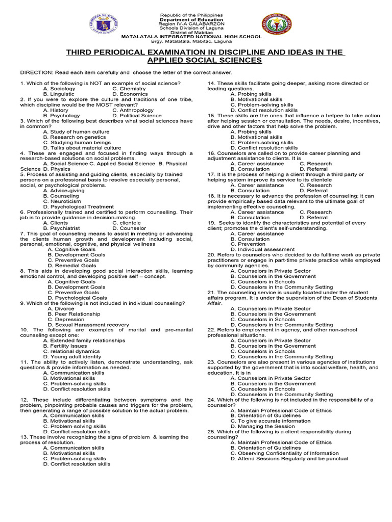 B. Psychology D. Political Science 15. These skills are the ones that influence a helpee to take action