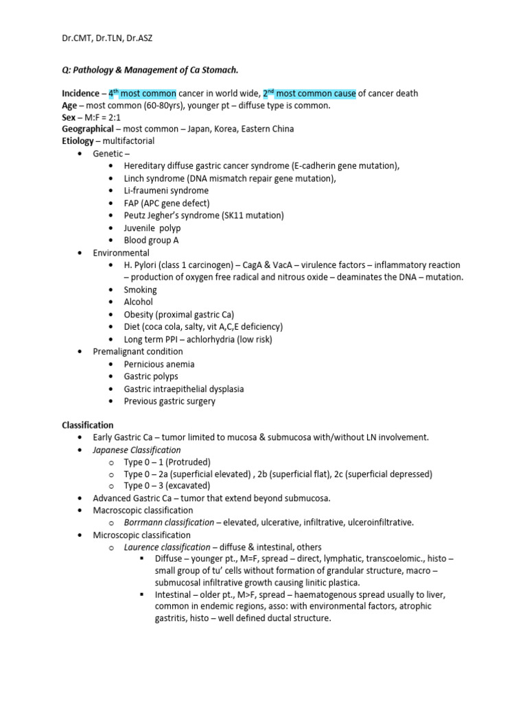 o Borrmann classification – elevated, ulcerative, infiltrative, ulceroinfiltrative.