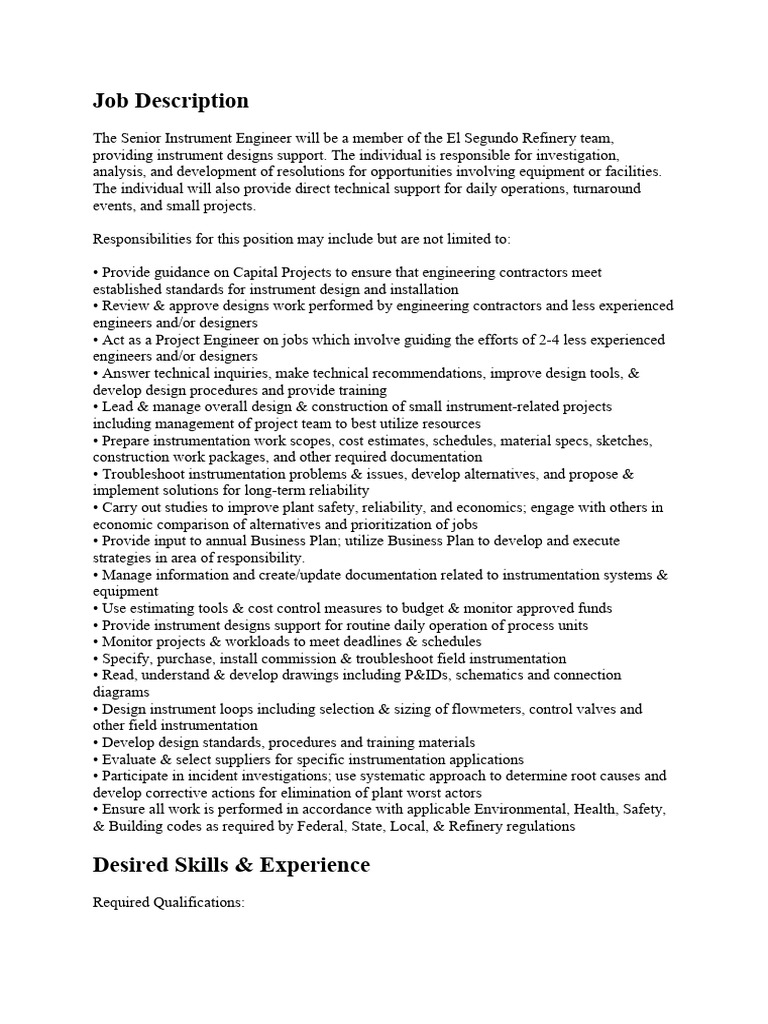 The Senior Instrument Engineer will be a member of the El Segundo Refinery team,