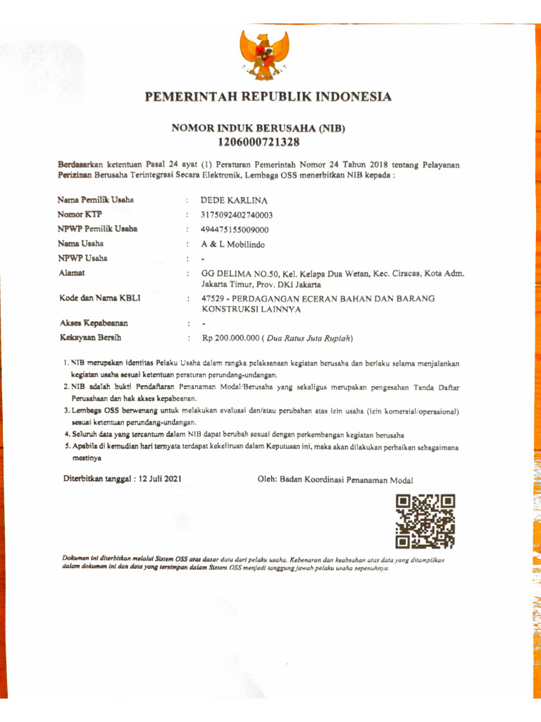 4, Seluruh data yang tercantum dalam NIB dapat berubah sesuai dengan perkembangan kegiatan berusaha,