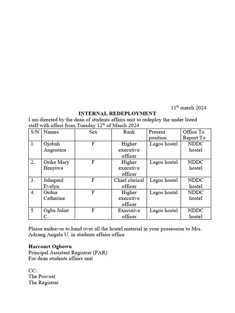 I am directed by the dean of students affairs unit to redeploy the under listed