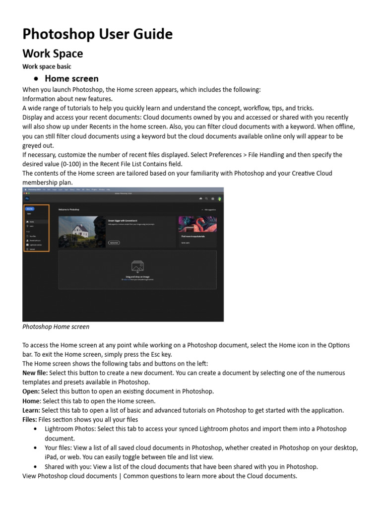When you launch Photoshop, the Home screen appears, which includes the following: