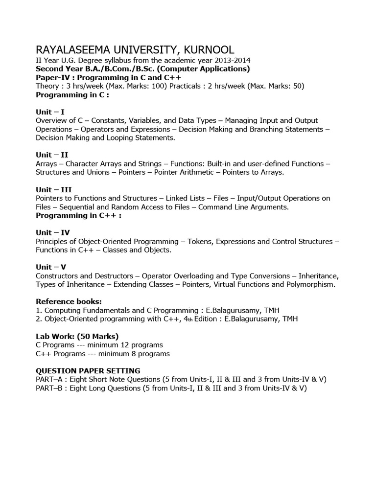 Rayalaseema University, Kurnool: Paper-IV: Programming in C and C++ Programming in C: Unit - I