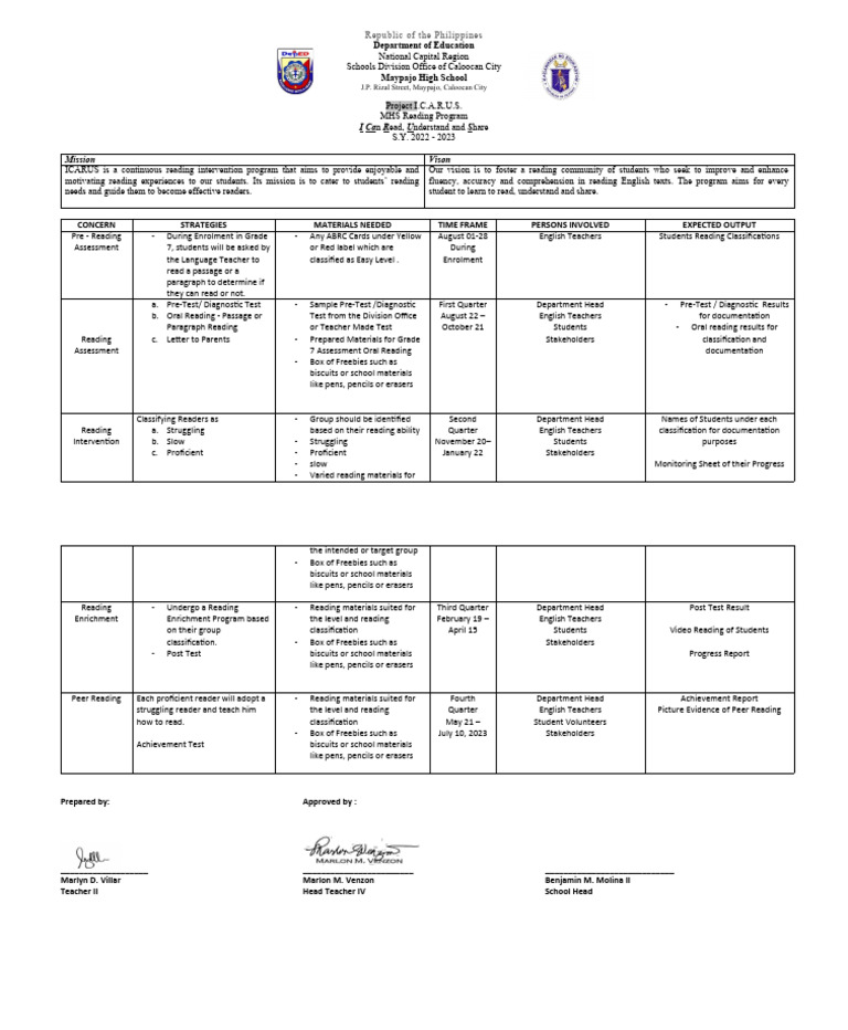 motivating reading experiences to our students. Its mission is to cater to students’ reading fluency, accuracy and comprehension in reading English texts. The program aims for every