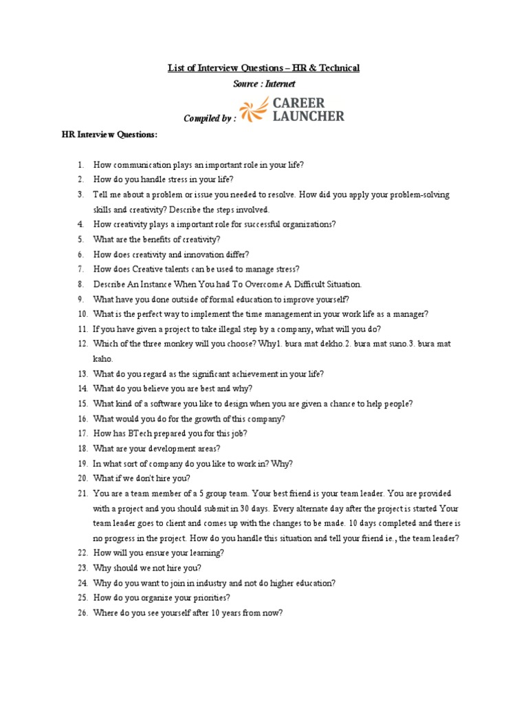 27. Why do you like to join this company? What would you do for the growth of this company? 28. Why do you think you would do well at this job? 29. What is more important to you: the money or the work? 30. Tell me about your ability to work under pressure? 31. Do your skills match this job or another job more closely? 32. What motivates you to do your best on the job? 33. Are you willing to work overtime? Nights? Weekends? 34. Would you be willing to relocate if required? 35. Are you willing to put the interests of the organization ahead of your own? 36. If you were hiring a person for this job, what would you look for? 37. What qualities do you look for in a boss? 38. Tell me about a time when you helped resolve a dispute between others? 39. What has been your biggest disappointment? 40. Do you have any questions for me? 41. Tell me about yourself? 42. What experience do you have in this field? 43. Do you consider yourself successful? 44. What do you know about this organization? 45. What have you done to improve your knowledge apart from those taught in the college? 46. Why do you want to work for this organization? 47. Are you a team player? 48. How long would you expect to work for us if hired? 49. If you had enough money to retire right now, would you? 50. Explain how you would be an asset to this organization? 51. What is your greatest strength? 52. Tell me about your dream job? 53. Do you prefer working alone or in groups ? 54. What has been the most important person or event in your own self development? 55. Which is your favorite subject? 56. What qualities do you have which will make you a committed and responsible professional in corporate life. 57. What kind of job do you see yourself holding five years from now? 58. Why did you decide to pursue engineering? 59. What would you say is the most important thing you are looking for in a job? 60. How can a Fresh(Without any Experience) Engineer contribute to a company's Growth? 61. What are short term and long term objectives? what are most significant achievement? 62. What goals do you have in your career?How do you plan to achieve these goals