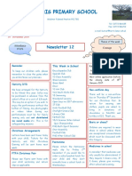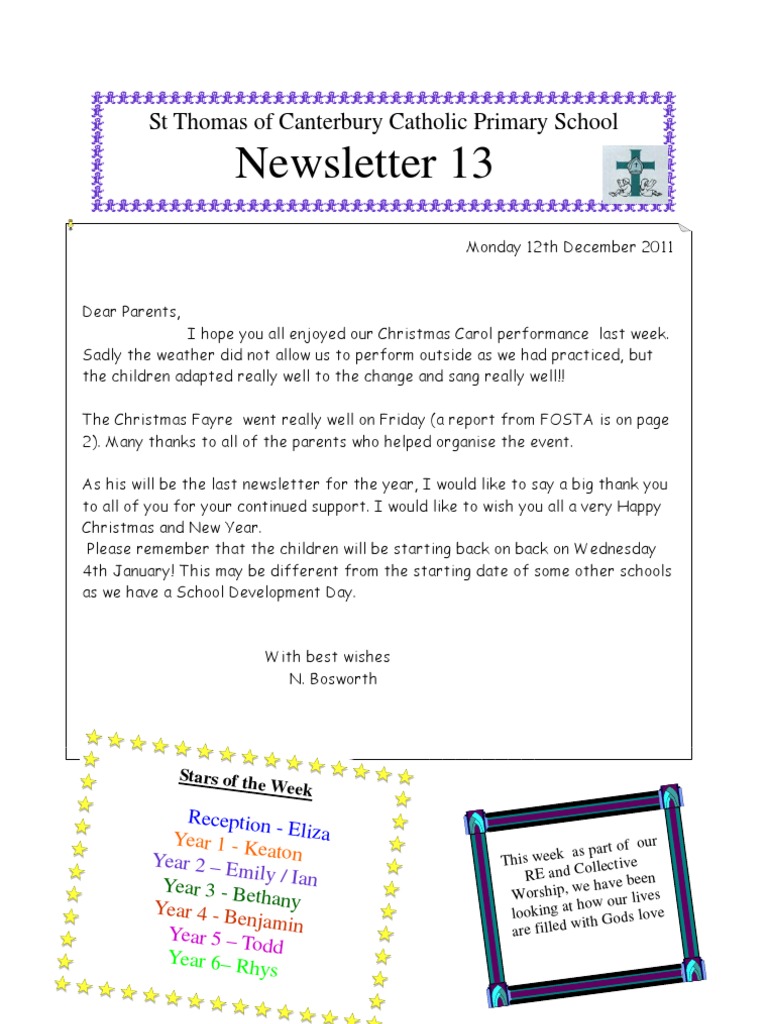 Monday 12th December 2011 Dear Parents, I hope you all enjoyed our Christmas Carol performance last week. Sadly the weather did not allow us to perform outside as we had practiced, but the children adapted really well to the change and sang really well!! The Christmas Fayre went really well on Friday (a report from FOSTA is on page 2). Many thanks to all of the parents who helped organise the event. As his will be the last newsletter for the year, I would like to say a big thank you to all of you for your continued support. I would like to wish you all a very Happy Christmas and New Year. Please remember that the children will be starting back on back on Wednesday 4th January! This may be different from the starting date of some other schools as we have a School Development Day.