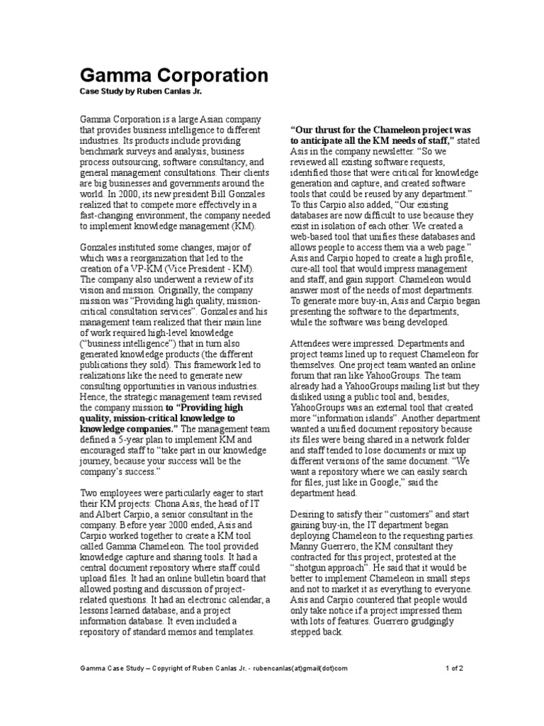 Gamma Corporation is a large Asian company that provides business intelligence to different industries. Its products include providing benchmark surveys and analysis, business process outsourcing, software consultancy, and general management consultations. Their clients are big businesses and governments around the world. In 2000, its new president Bill Gonzales realized that to compete more effectively in a fast-changing environment, the company needed to implement knowledge management (KM). Gonzales instituted some changes, major of which was a reorganization that led to the creation of a VP-KM (Vice President - KM). The company also underwent a review of its vision and mission. Originally, the company mission was Providing high quality, missioncritical consultation services. Gonzales and his management team realized that their main line of work required high-level knowledge (business intelligence) that in turn also generated knowledge products (the different publications they sold). This framework led to realizations like the need to generate new consulting opportunities in various industries. Hence, the strategic management team revised the company mission to Providing high quality, mission-critical knowledge to knowledge companies. The management team defined a 5-year plan to implement KM and encouraged staff to take part in our knowledge journey, because your success will be the companys success. Two employees were particularly eager to start their KM projects: Chona Asis, the head of IT and Albert Carpio, a senior consultant in the company. Before year 2000 ended, Asis and Carpio worked together to create a KM tool called Gamma Chameleon. The tool provided knowledge capture and sharing tools. It had a central document repository where staff could upload files. It had an online bulletin board that allowed posting and discussion of projectrelated questions. It had an electronic calendar, a lessons learned database, and a project information database. It even included a repository of standard memos and templates.