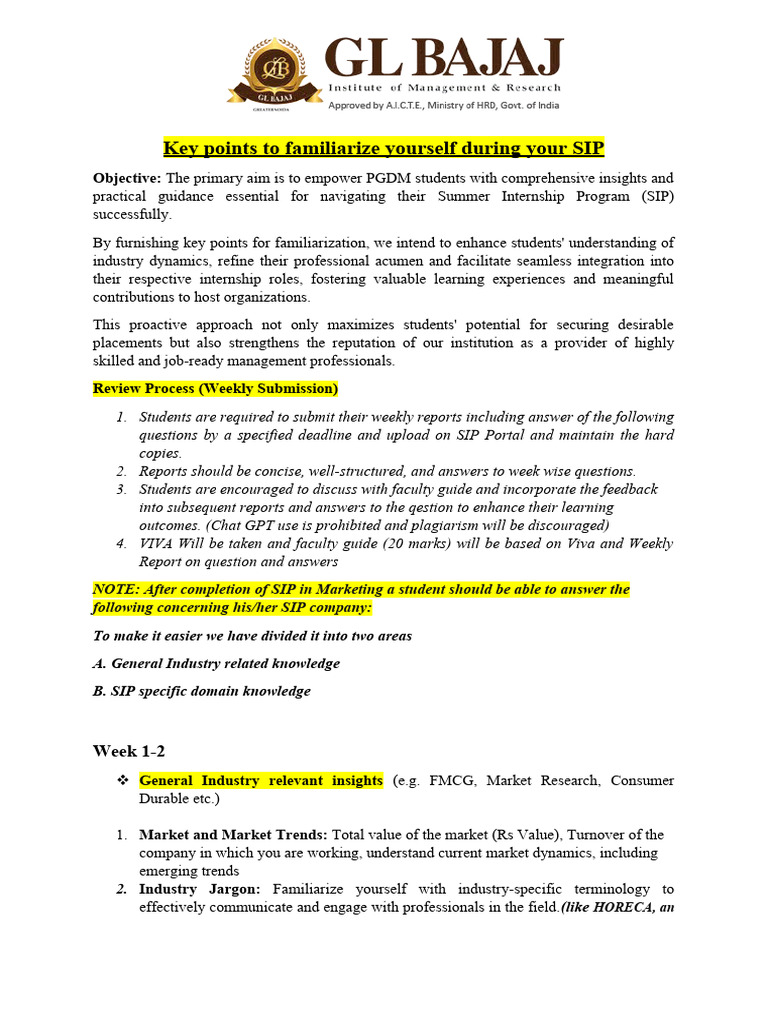NOTE: After completion of SIP in Marketing a student should be able to answer the