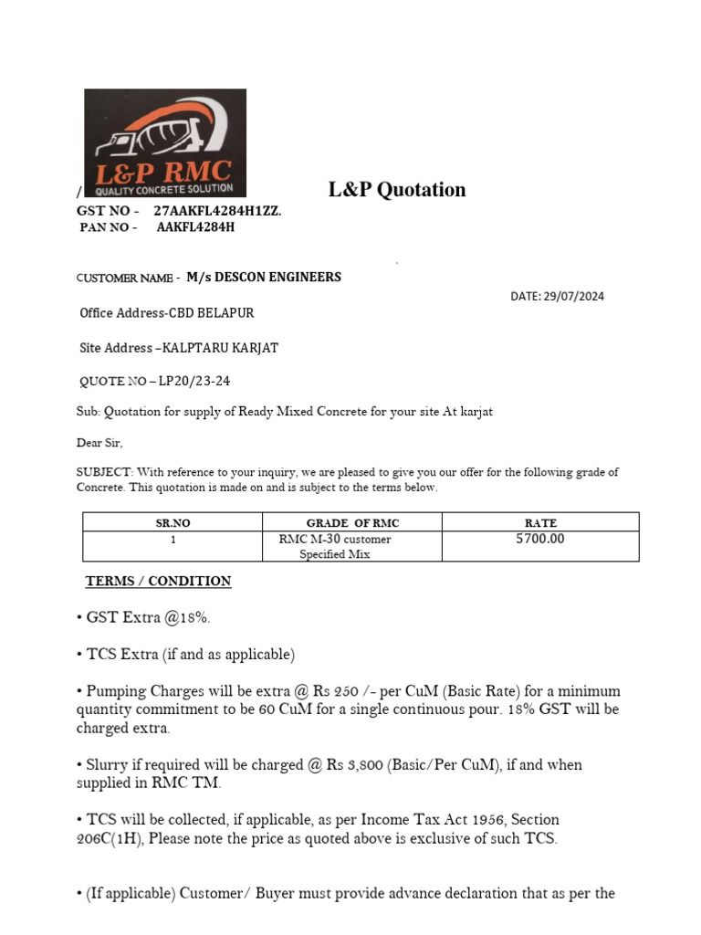 Sub: Quotation for supply of Ready Mixed Concrete for your site At karjat