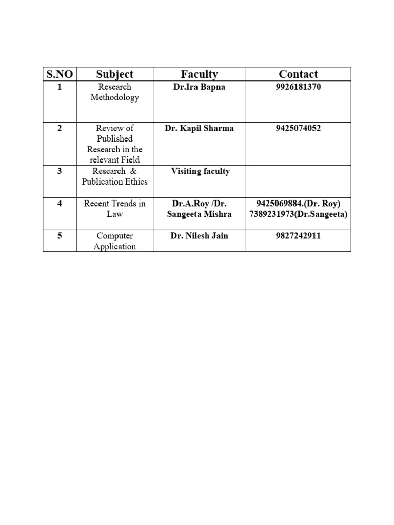 NO Subject Faculty Contact