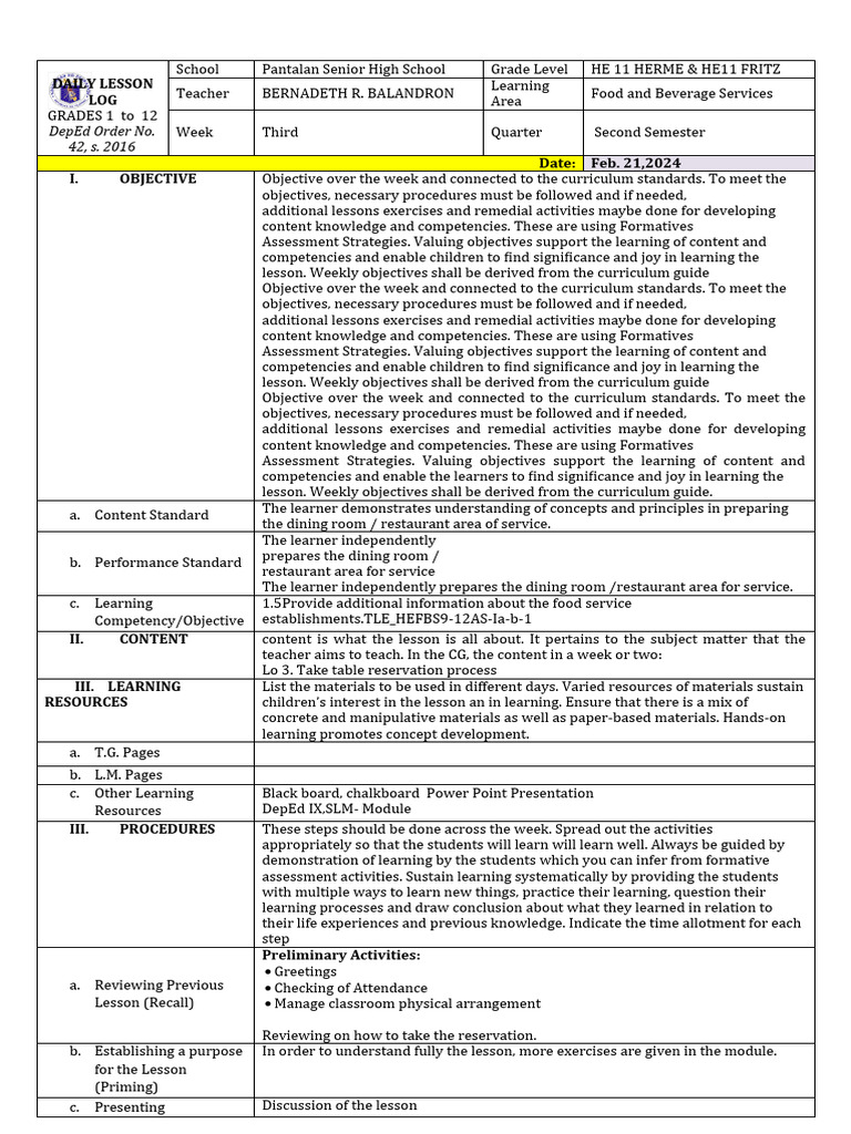 LOG Teacher BERNADETH R. BALANDRON Food and Beverage Services