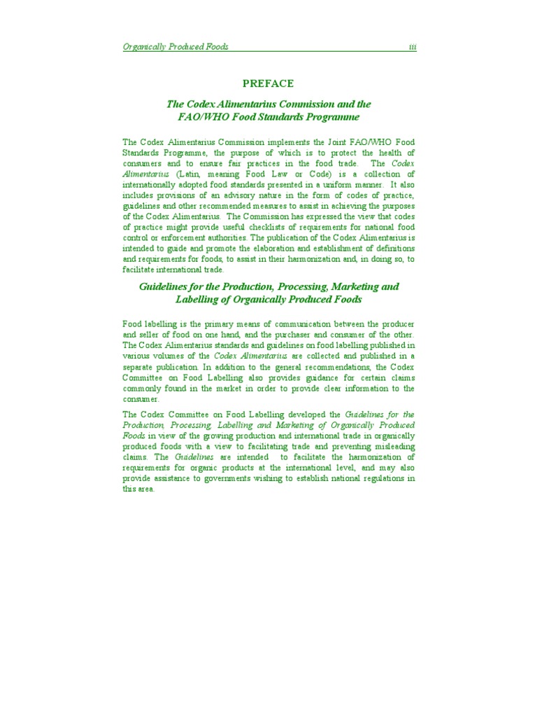 The Guidelines include general sections describing the organic production concept and the scope of the text; description and definitions; labelling and claims (including products in transition/conversion); rules of production and preparation, including criteria for the substances allowed in organic production; inspection and certification systems; and import control. The Codex Alimentarius Commission at its 23rd Session in 1999 adopted the Guidelines for the Production, Processing, Labelling and Marketing of Organically Produced Foods, with the exception of the provisions for livestock and livestock products. The Codex Alimentarius Commission at its 24th Session in 2001 adopted the sections concerning livestock and livestock products and bee-keeping and bee products for inclusion in the Guidelines for the Production, Processing, Labelling and Marketing of Organically Produced Foods. The publication of the Guidelines in this compact format is to allow their wide use and understanding by governments, regulatory authorities, food industries and retailers, and consumers. Further information on these texts, or any other aspect of the Codex Alimentarius Commission, may be obtained from: The Secretary, Codex Alimentarius Commission, Joint FAO/WHO Food Standards Programme, FAO, Viale delle Terme di Caracalla, 00100, Rome Italy fax: +39(06)[Link] email: codex@[Link] [Link]