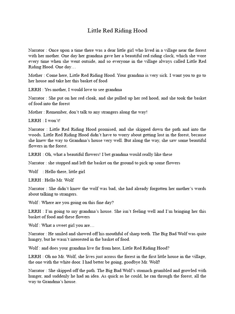 Wolf : It’s me grandma, Little Red Riding Hood, and I bought you a basket of food.