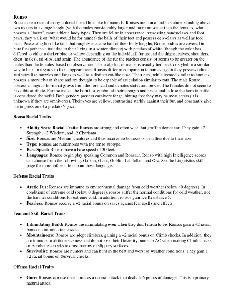 • Ability Score Racial Traits: Ronsos are strong and often wise, but gruff in demeanor. They gain +2