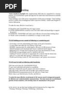 Team is small no of people with complementary skills who are committed to a common purpose, set of performance goals and approach for which they hold themselves mutually accountable Team building is one of the prime responsibilities of the project manager. Team building involves a whole idea of management skills required to identify, commit and integrate to various tasks group To make the team effective it must have a # REASON AND CHARTER from the larger system # INTER-DEPENDENCE, members need each others skills and knowledge to support the project # WORKING TOGETHER will lead to more effective decisions than working alone # TEAM creates measurable accountability to a larger or main system. TEAM building process consists of following as a monitoring part - IT develops a role for understanding and clarity on the part of members - IT must define and refine the very purpose of the team - PROPER communication for enhancing the efficiency of effectiveness of team - GROUP members need emotional and resource (material) based support - PERSONALITY of team must be known by processes and dynamism of team - PROBLEM solving strategies must be clarified at all levels - CONFLICT must be used more as opportunity for creativity than for destruction - ABILITY to work with other group in collaborative way is must - TEAM must develop a sense of self-consciousness and group-consciousness TEAM must be built on following solid foundation THE team must share the LEADERSHIP ROLE IT must carry individual and mutual accountability THE team is formed for specific purpose and ensure it delivers THE team works collectively and encourages open ended discussion PERFORMANCE measurement must be on collective (Team) basis REAL team is one that discusses, decides, and delivers To make the team effective, involvement of all concern must be integrated properly by effective and understandable communication. The team must aim at professional growth of team members, who develop sense of commitment to the project