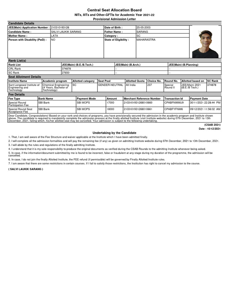 December, 2021, failing which, his/her allotted seat may be cancelled. Your admission is subject to the following undertaking.