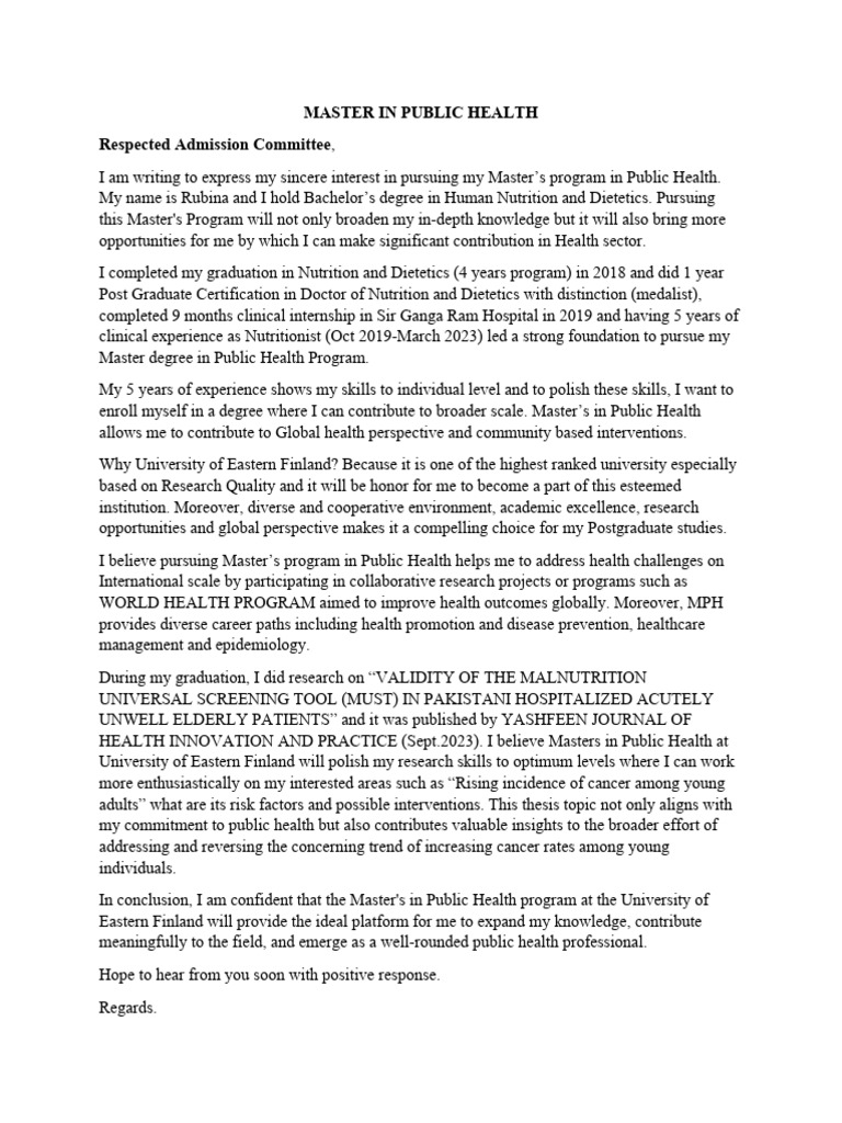 I am writing to express my sincere interest in pursuing my Master’s program in Public Health.