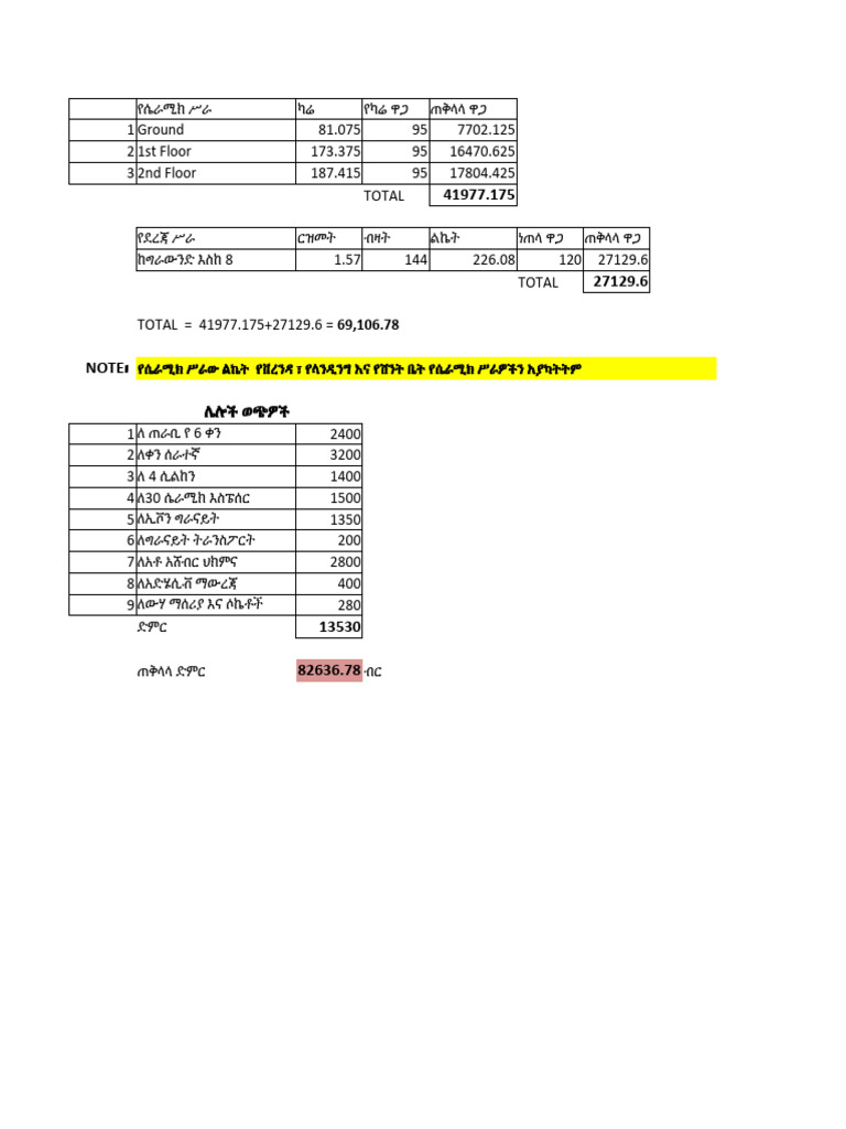 NOTE፡ የሴራሚክ ሥራው ልኬት የቨረንዳ ፣ የላንዲንግ እና የሽንት ቤት የሴራሚክ ሥራዎችን አያካትትም