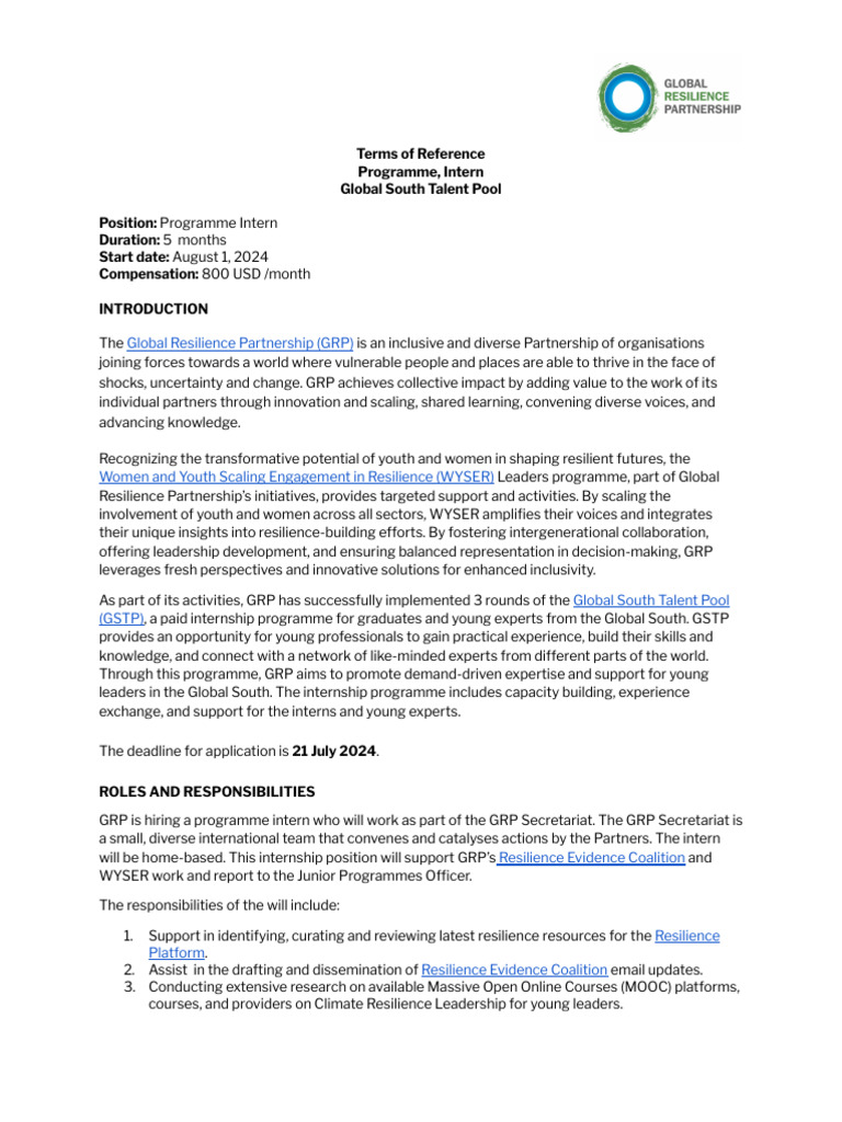 will be home-based. This internship position will support GRP’s Resilience Evidence Coalition and