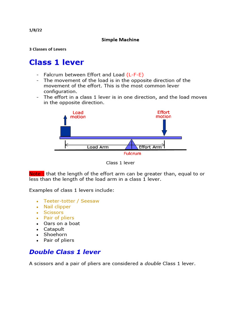 - The effort in a class 1 lever is in one direction, and the load moves