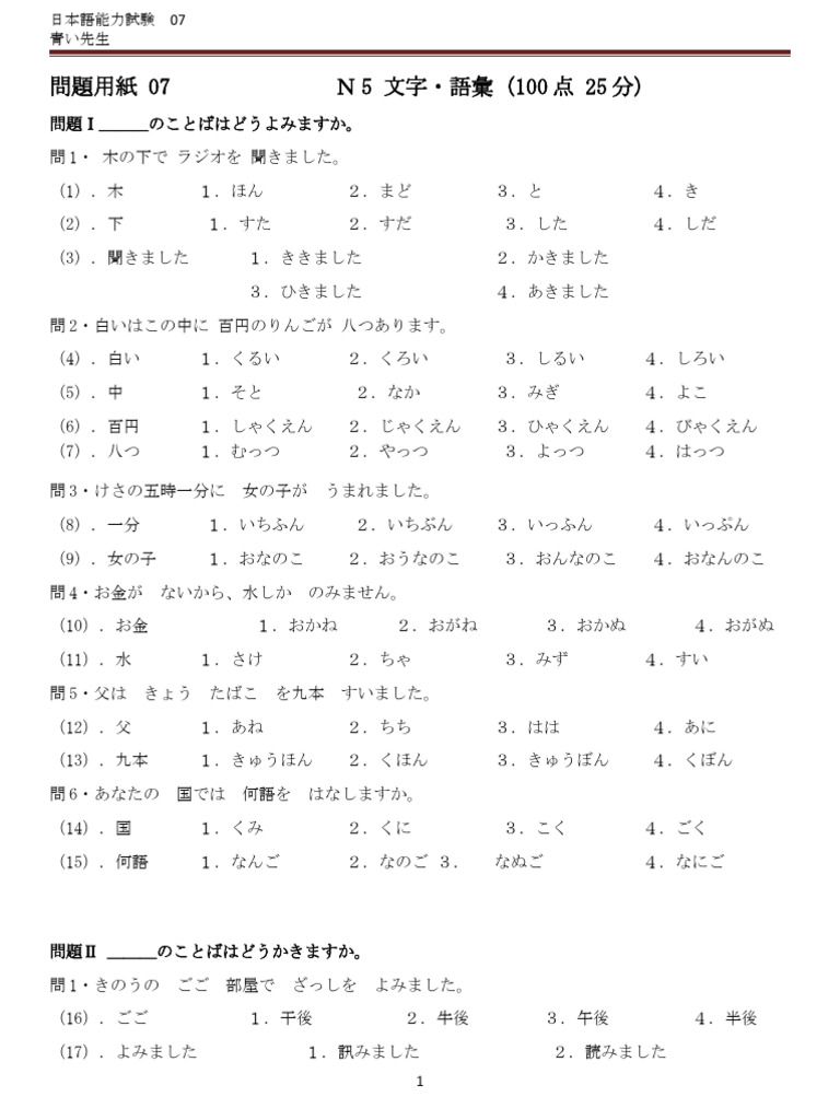 問題用紙 07 N 5 文字・語彙 (100 点 25 分)