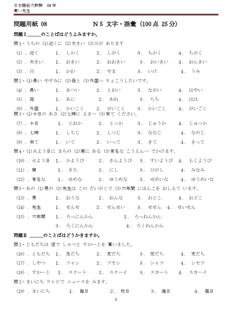問題用紙 08 N 5 文字・語彙 (100 点 25 分)