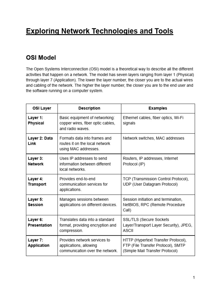 activities that happen on a network. The model has seven layers ranging from layer 1 (Physical)