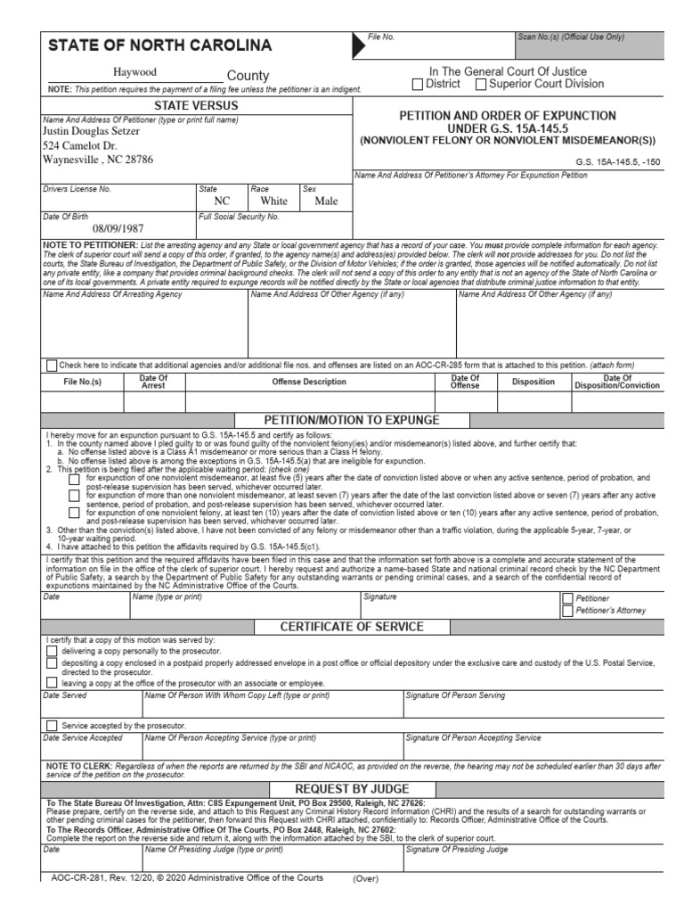petition, such as a criminal history report and any NCAOC report of prior expunctions. If granted, send a certified copy of this Order to the petitioner at the address listed on Side One