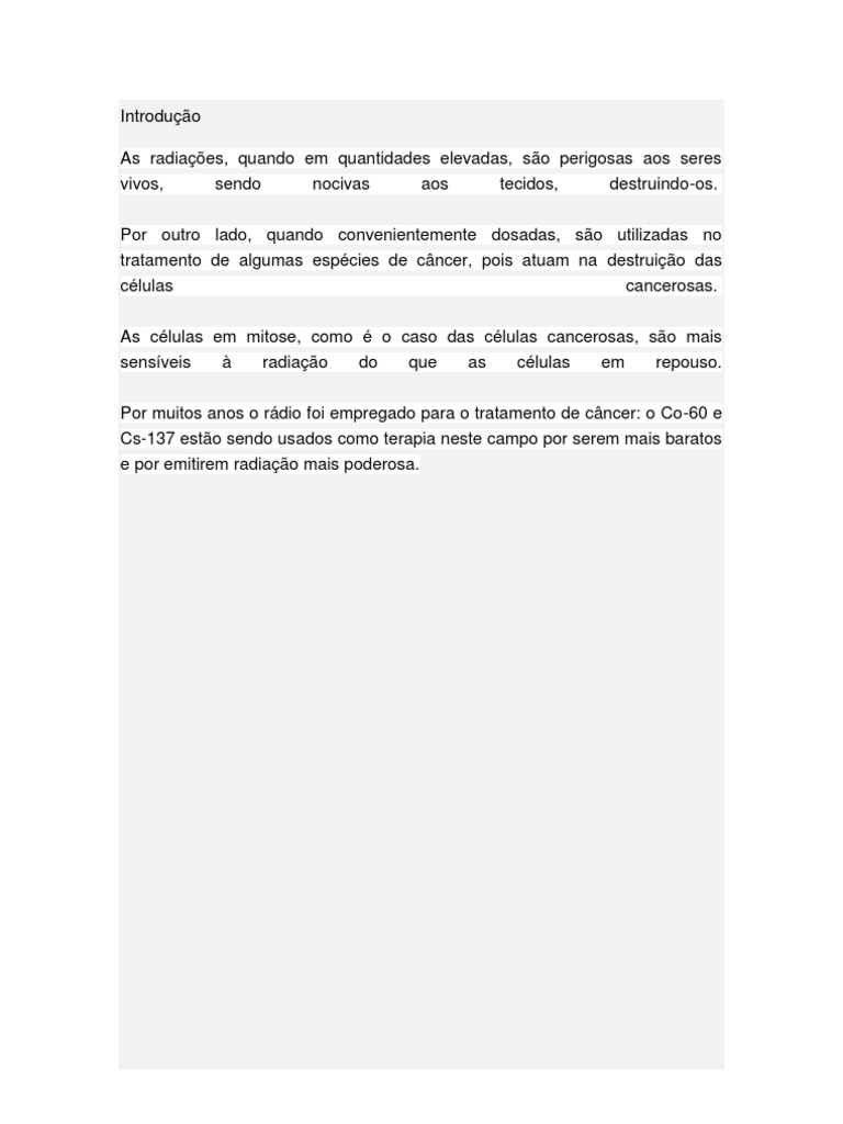 Por outro lado, quando convenientemente dosadas, so utilizadas no tratamento de algumas espcies de cncer, pois atuam na destruio das clulas cancerosas. As clulas em mitose, como o caso das clulas cancerosas, so mais sensveis radiao do que as clulas em repouso. Por muitos anos o rdio foi empregado para o tratamento de cncer: o Co-60 e Cs-137 esto sendo usados como terapia neste campo por serem mais baratos e por emitirem radiao mais poderosa.