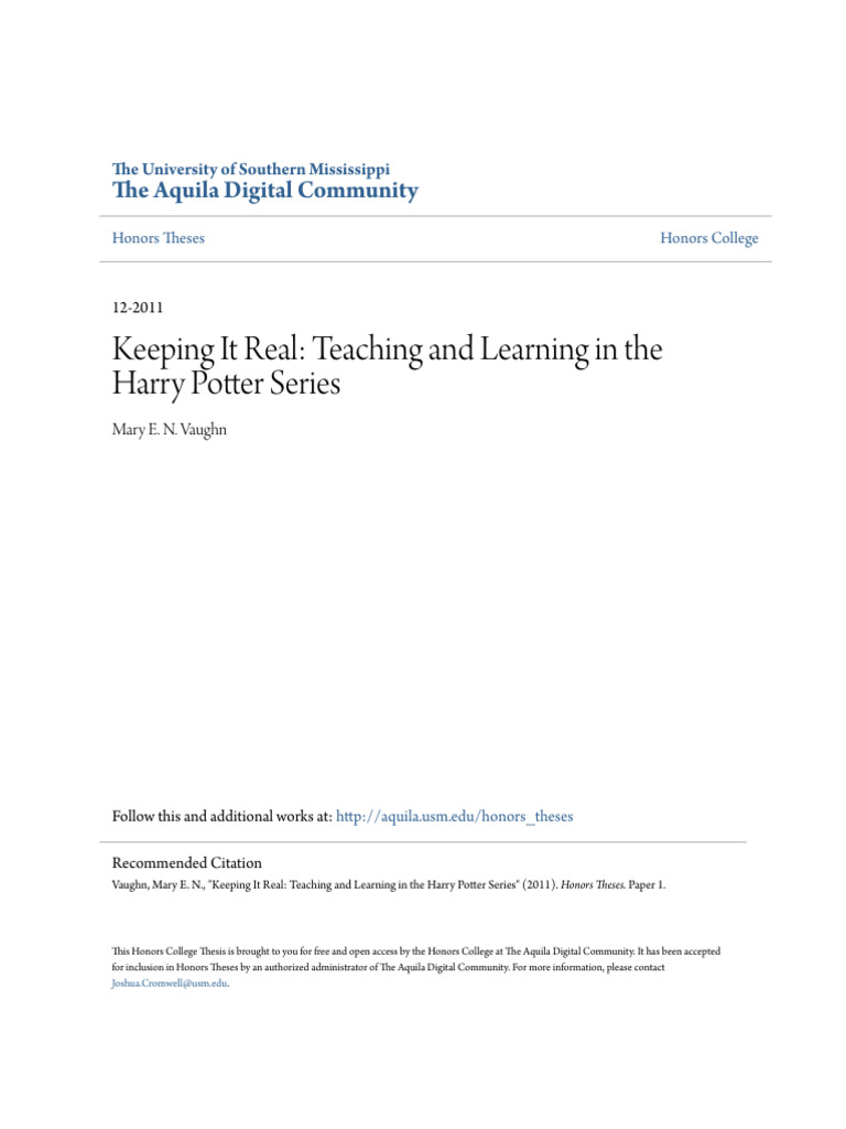 Vaughn, Mary E. N., "Keeping It Real: Teaching and Learning in the Harry Potter Series" (2011). Honors Theses. Paper 1.