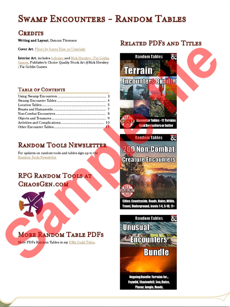 Swamp Encounter Tables ............................................................. 4