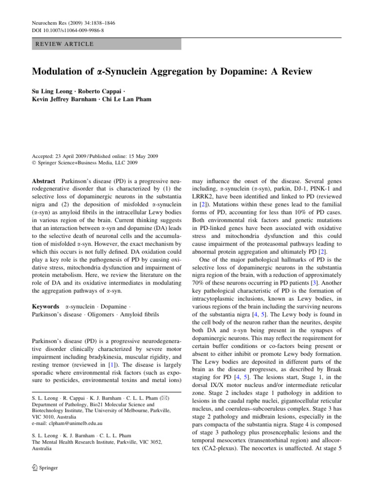 folding diseases. Nature 416:507–511. doi:10.1038/416507a 62. Cappai R, Leck SL, Tew DJ et al (2005) Dopamine promotes