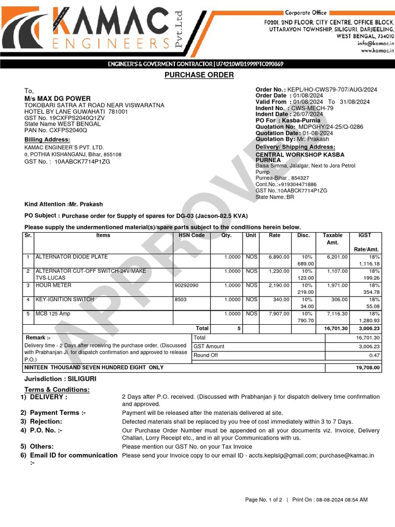 M/s MAX DG POWER Valid From : 01/08/2024 To 31/08/2024