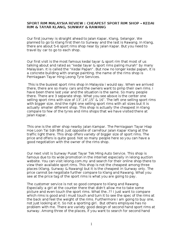 ; RAWANG Our first journey is straight ahead to Jalan Kapar, Klang, Selangor. We planned to go to Klang first then to Sunway and the last is Rawang. In Klang, there are about 5-6 sport rims shop near by Jalan Kapar. But you need to travel by car to go to each shop. Our first visit is the most famous kedai tayar & sport rim that most of us talking about and rated as kedai tayar & sport rims paling murah by many Malaysian. It is called the Kedai Papan. But now no longer kedai papan, it is a concrete building with orange painting. the name of the rims shop is Perniagaan Tayar Hing Leong Tyre Services. This is the busiest sport rims shop in Malaysia i would say. When we arrived there, there are so many cars and the owners want to pimp their own rims. I have been there last year and the situation is the same. So many people there. There are 3 separate shop. What you see above is the center one selling sport rims with size of 13,14,15 & 16. The left one selling sport rims with bigger size. And the right one selling sport rims with all sizes but it is actually smaller different shop. This shop is actually the cheapest in Klang compare to few of the tyres and rims shops that we have visited there at Jalan Kapar. This one is the other shop nearby Jalan Kampar. The Perniagaan Tayar Hiap Hoe Loon Tai Sdn Bhd. Just opposite of carrefour Jalan Kapar Klang at the traffic light there. This shop offers variety of bigger size of sport rims. The price and offers is quite good. Not so many people here so you can have a good negotiation with the owner of the rims shop. Our next visit is Sunway Pusat Tayar Tek Ming Auto Service. This shop is famous due to its wide promotion in the internet especially in lelong auction website. You can visit lelong.com.my and search for their online shop there to view their available sport rims. This shop is not the cheapest among three places (Klang, Sunway & Rawang) but it is the cheapest in Sunway only. The price cannot be negotiate further compare to Klang and Rawang. What you see at the price tag of the sport rims is what you are going to pay. The customer service is not so good compare to Klang and Rawang. Especially a girl at the counter there that didnt allow me to take some picture and even touch the sport rims. What the..?? I just want to compare which rims is good and i must touch and turn it to see the spec of the rims at the back and feel the weight of the rims. Furthermore I am going to buy one, not just looking at it. So not a sporting girl. But others employee has no problem with me. There are variety good design of second hand sport rims at sunway. Among three of the places, if you want to search for second hand