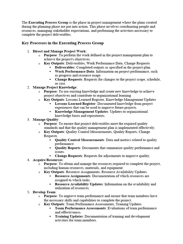 o Key Outputs: Deliverables, Work Performance Data, Change Requests