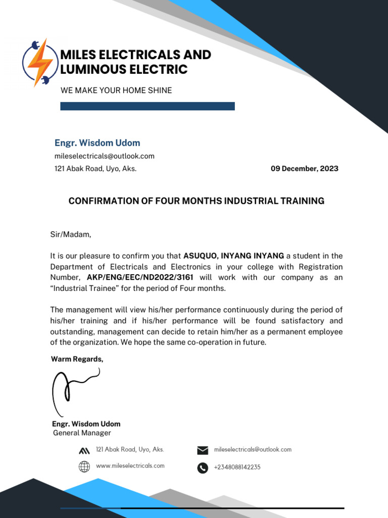 CONFIRMATION OF FOUR MONTHS INDUSTRIAL TRAINING