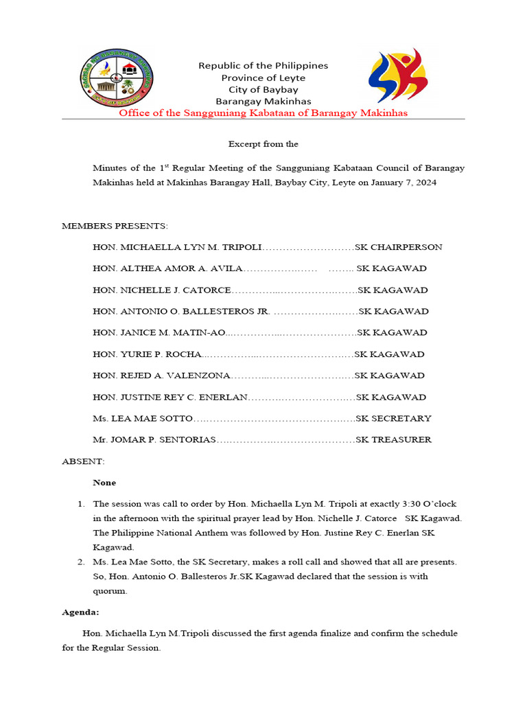 Minutes of the 1st Regular Meeting of the Sangguniang Kabataan Council of Barangay
