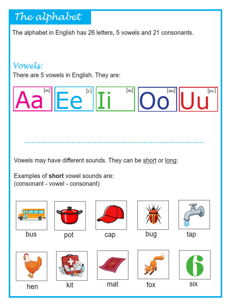The alphabet in English has 26 letters, 5 vowels and 21 consonants.