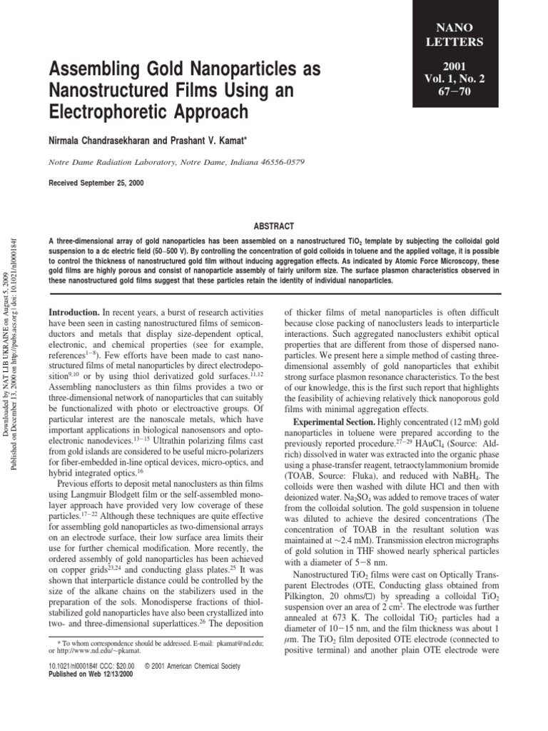 (1) (2) (3) (4) Steigerwald, M. L.; Brus, L. E. Acc. Chem. Res. 1990, 23, 183. Wang, Y.; Herron, N. Science 1996, 273, 632. Henglein, A. J. Phys. Chem. 1993, 97, 5457. Kamat, P. V. Composite Semiconductor Nanoclusters. In Semiconductor Nanoclusters - Physical, Chemical and Catalytic Aspects; Kamat, P. V., Meisel, D., Eds.; Elsevier Science: Amsterdam, 1997; p 237. Mulvaney, P.; Giersig, M.; Henglein, A. J. Phys. Chem. 1993, 97, 7061. Pileni, M. P. New J. Chem. 1998, 693. Henglein, A. Langmuir 1998, 14, 6738. Link, S.; El-Sayed, M. A. J. Phys. Chem. B 1999, 103, 4212. Trau, M.; Sankaran, S.; Saville, D. A.; Aksay, I. A. Nature 1995, 374, 437.