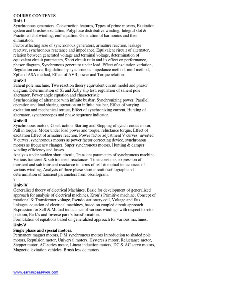 COURSE CONTENTS Unit-I Synchronous generators, Construction features, Types of prime movers, Excitation system and brushes excitation,