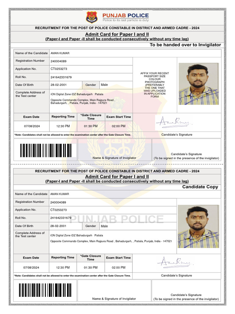 Punjab Police Constable Exam Admit Card 2024
