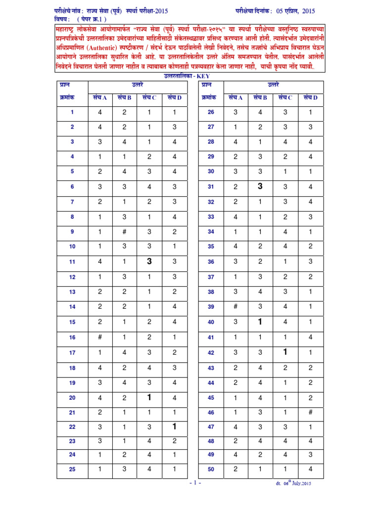 आयोगाने उत्तरतािलका सुधािरत केली आहे . या उत्तरतािलकेतील उत्तरे अंितम समजण्यात ये तील. यासंदभार्त आलेली