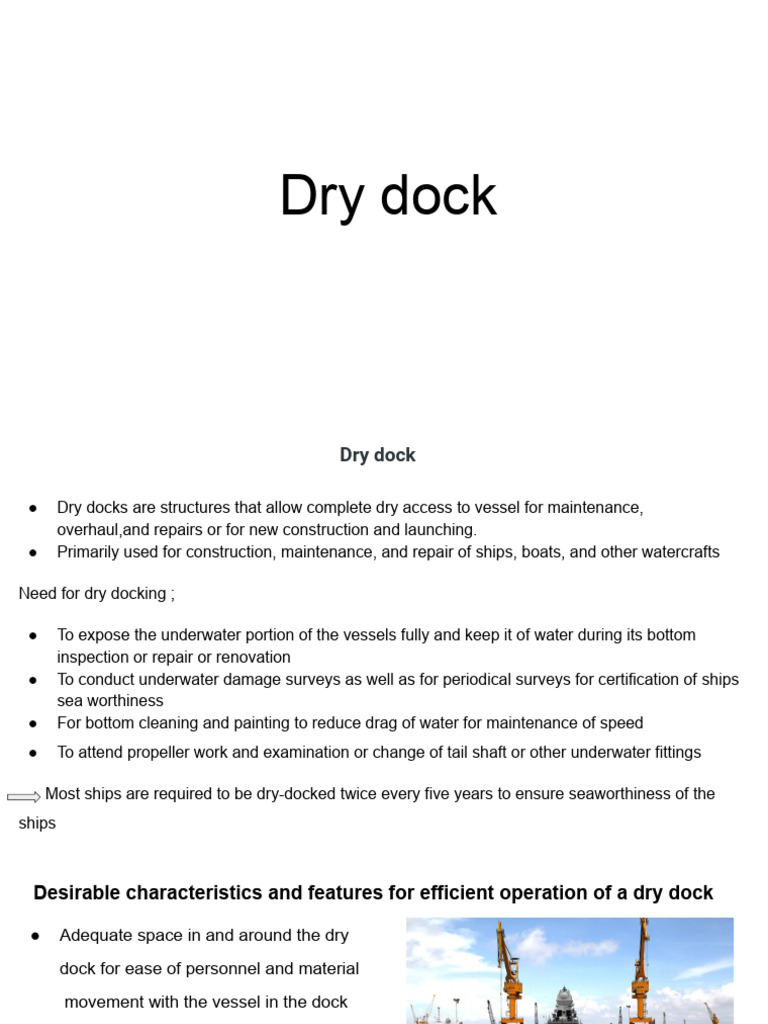 ● Dry docks are structures that allow complete dry access to vessel for maintenance,